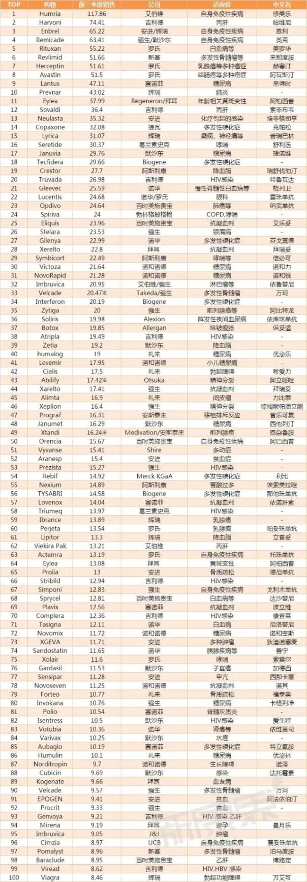 2016年第三季度全球藥物銷售額100強(qiáng)